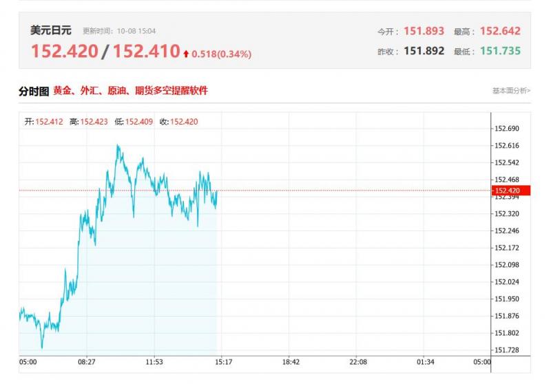 美元兑日元今日汇率最高152.420 ,最低152.410 ,涨跌0.518 ,涨跌幅0.34% 。