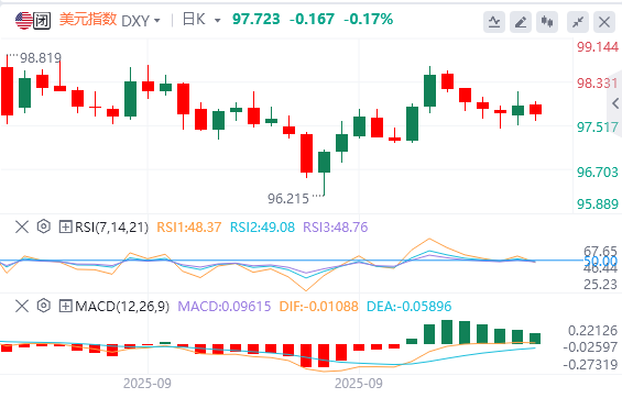 本周,美元整体表现疲软,自上周高点回落,拖累美元指数(DXY)下滑至97.50区域附近,不过仍在8月初以来更广泛的整合区间内波动。交易者预期美联储(Fed)将进一步降息,给美元带来下行压力,而美国联邦政府停摆又增添了不确定性,使市场对美元的情绪愈发悲观。债券市场方面,国债收益率大部分时间呈下滑态势,仅在周末前有所回升。