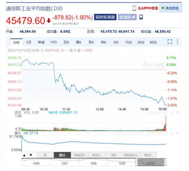 一、美股股市:道指跌878.82点,跌幅为1.90%,报45479.60点;纳指跌820.20点,跌幅为3.56%,报22204.43点;标普500指数跌182.59点,跌幅为2.71%,报6552.52点。纳指、标普500指数创4月10日以来最大单日跌幅。大型科技股普跌,亚马逊(AMZN.US)、特斯拉(TSLA.US)、英伟达(NVDA.US)跌约5%,苹果(AAPL.US)跌3.45%。纳斯达克中国金龙指数收跌超6%,阿里巴巴(BABA.US)和百度(BIDU.US)均跌超8%,哔哩哔哩(BILI.US)跌9%。