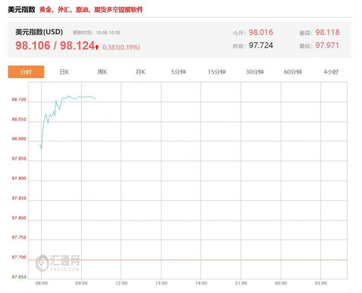 周 一(10月06日)早盘,美元指数最新价报98.124,涨幅0.39%,开盘价为98.016。美联储副主席杰斐逊周五重申担忧:当前美联储正同时面对两个难题——劳动力市场正在走软,而通胀依然高于目标水平