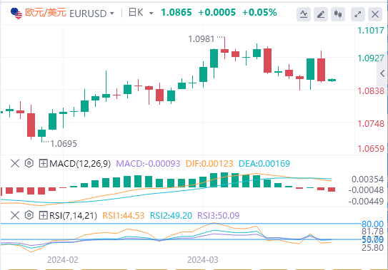 在此背景下,市场维持普遍的风险厌恶行情促使欧元/美元明显回落至1.0800中档,迄今为止出现了一些初步争夺,延续近期自近期高点1.0900中档上方回调的趋势。德国3月份制造业和服务业采购经理人指数初值疲弱,这也进一步打压欧元/美元。