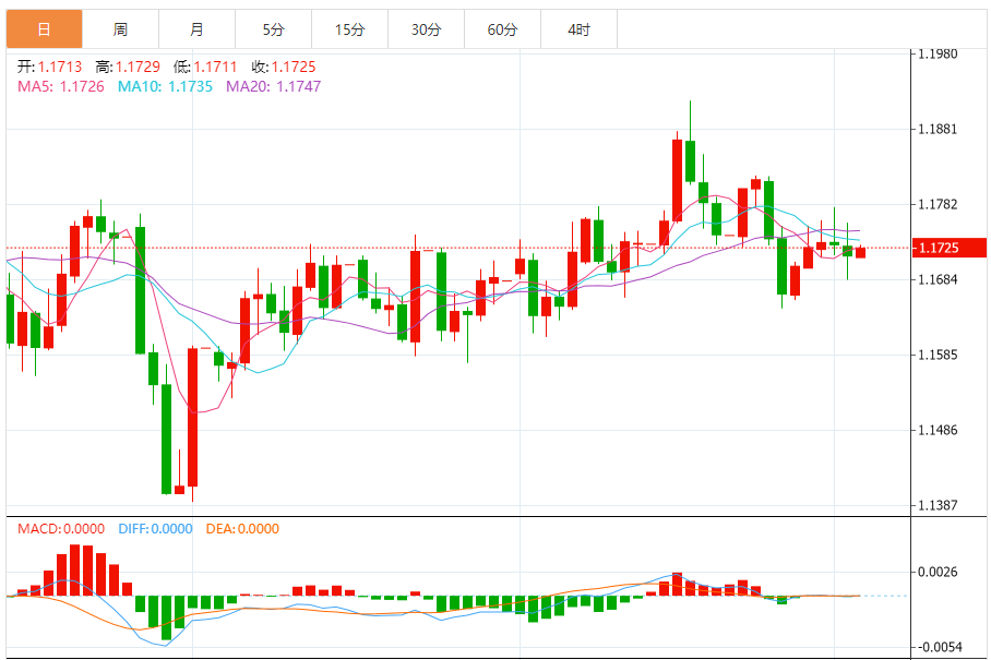 周五,欧元/美元徘徊于1.1725下方,现交投于1.1724附近,涨幅0.08%。