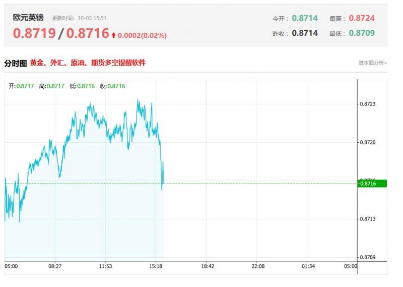 周五盘中,欧元/英镑报0.8722, 涨幅0.02%.