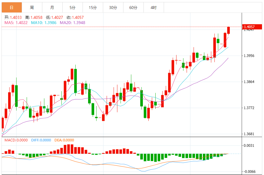 周二,美元/加元徘徊于1.4059下方,现交投于1.4057附近,涨幅0.15%。