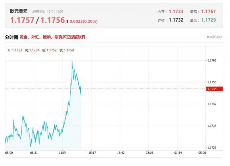 截至目前,欧元/美元上涨0.20%,报1.1756。