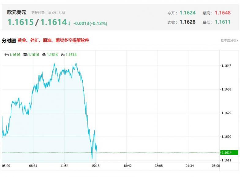截至目前,欧元/美元下跌0.12%,报1.1614。