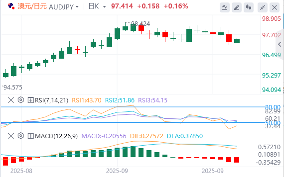 10月2日,周四欧市初盘,澳元/日元交叉盘在97.35附近走强。风险偏好情绪削弱了日元兑澳元等避险货币。