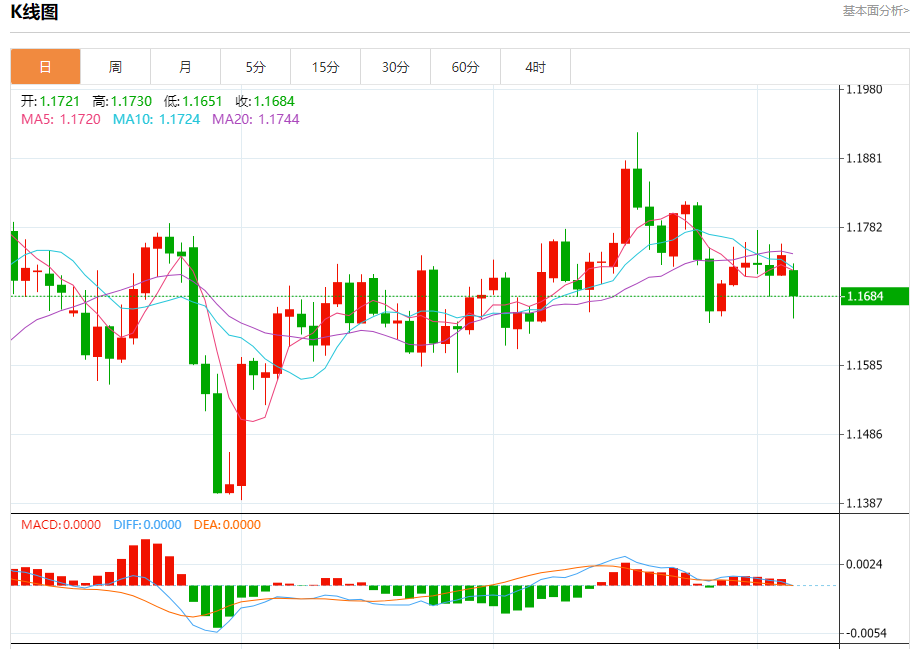 周一盘中,欧元/美元报1.1686,跌幅0.46%。