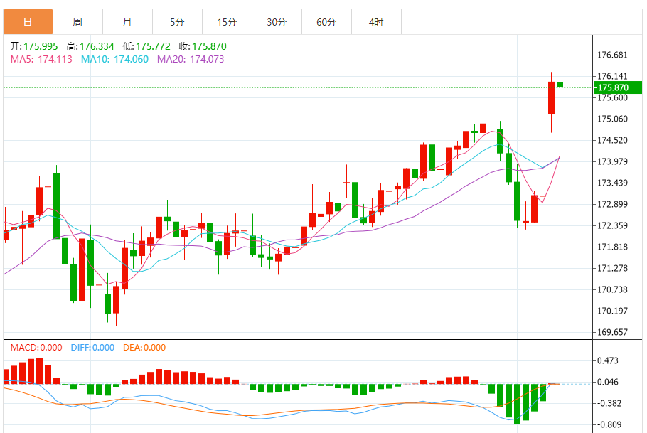 随机指标(Stochastic)在50水平上方的反弹将提供新的机会获得额外收益,预期其将上涨至176.95。若突破此阻力位,将进一步推动交易至下一个目标177.45;而价格下跌至175.20以下并收出负面收盘,可能迫使其形成看跌修正行情,才可能触及任何建议目标。
