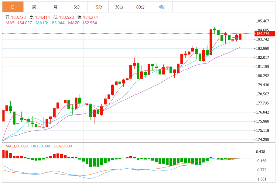 周五,欧元/日元上涨0.30%至184.311附近。
