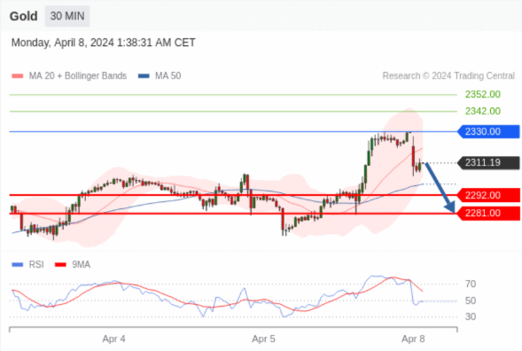 4月8日,周一亚市早盘,美元指数在104.41获非农就业报告(NFP)超出预期的支撑,黄金回调后遇逢低买盘,金价在2308美元喘息。