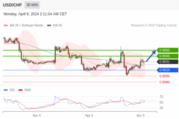 在 0.9010 之上,看涨,目标价位为 0.9045 ,然后为 0.9060 。