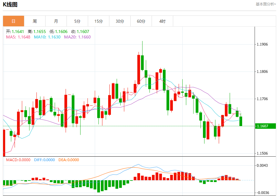 汇价高见1.1655,低见1.1606。上一交易日,汇价收于1.1641。