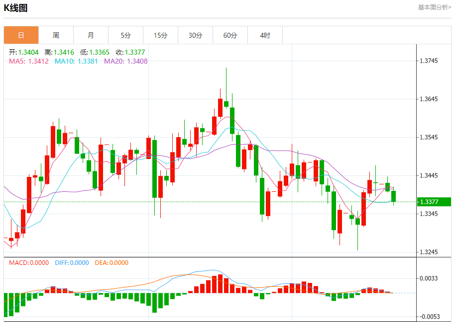 汇价高见1.3415,低见1.3366。上一交易日,汇价收于1.3404。