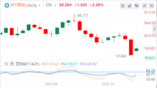 周一亚盘,原油交投59.26附近。特朗普的最新关税威胁给本已供应过剩的市场的需求前景蒙阴。油价下跌是多重因素共同作用的结果,特朗普威胁大幅加征关税只是最新一项,石油输出国组织(OPEC)增产、北美和南美的额外供应增长,以及加沙停火协议后地缘政治风险缓解,都是叠加在特朗普关税威胁之上的利空因素。投资者还担心,美国政府若长期停摆,可能会削弱美国经济,进而打压全球最大原油消费国的需求。