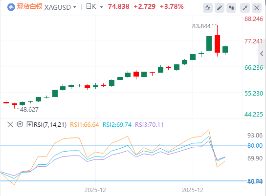 白银价格走势展望:白银在超买区内上涨至接近74.50美元