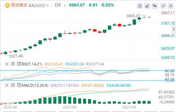 金价周三飙升,创下3895美元的历史新高,但此后有所回落,涨幅超过0.30%。美国政府关门和就业数据弱于预期,重申了投资者对美联储将在即将举行的会议上降息的立场。