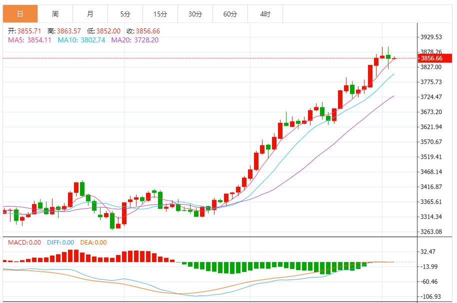小时级别:在连续的窄幅震荡之后技术形态开始逐步调整,短周期均线开始逐步勾头向上发散,K线开始慢慢站上短周期均线,倾向于在短期走势上可能会有一些反弹的空间。不过,黄金冲击3900再度失败,目前已经从3896一路跌幅至3819一线反弹,若再度下跌破位3800,那么就需要继续测试3780的均线支撑位置。