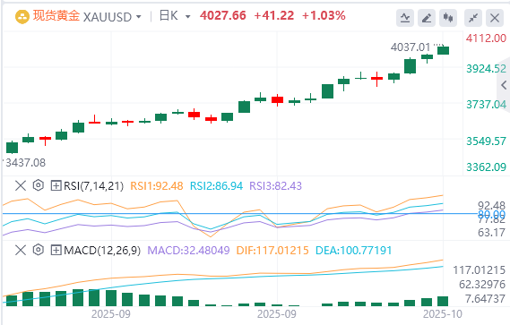 10月8日,黄金正在延续近期创纪录的涨势,并在周三亚洲时段突破4,000美元心理关口的势头上再接再厉。美国政府关门导致经济不确定性增加,加上对美联储进一步降息的预期坚定,成为推动资金流向避险金条的关键因素。此外,贸易和地缘政治紧张局势加剧,加上央行购买力强劲,在全球风险情绪略有恶化的情况下推动了强劲上涨。