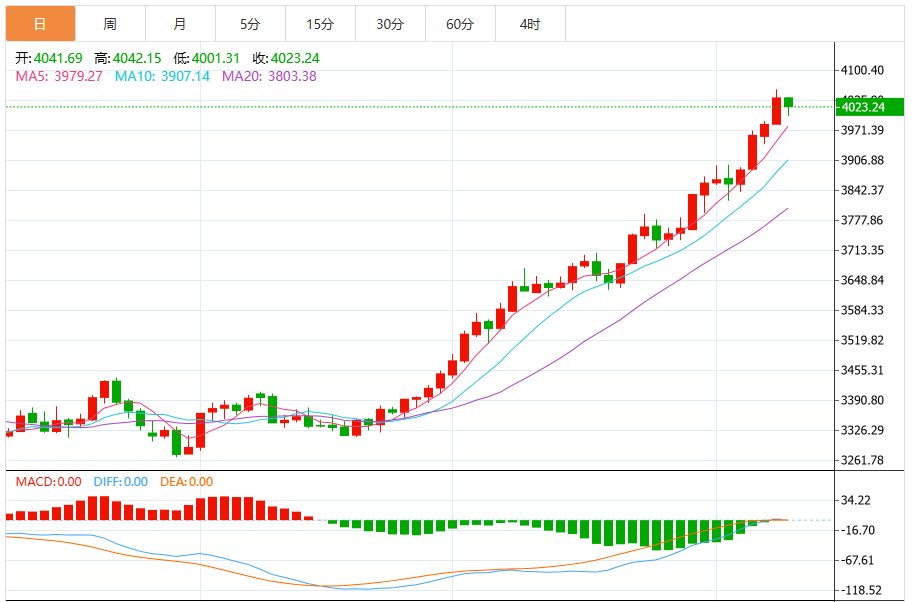 周四(北京时间10月9日)亚市早盘,现货黄金交投于4020美元/盎司附近,现货黄金周伞首次突破每盎司4000美元大关,延续破纪录涨势至4059.07美元/盎司。地缘政治与经济不确定性加剧,以及市场对美国降息的预期,促使投资者涌入避险资产。