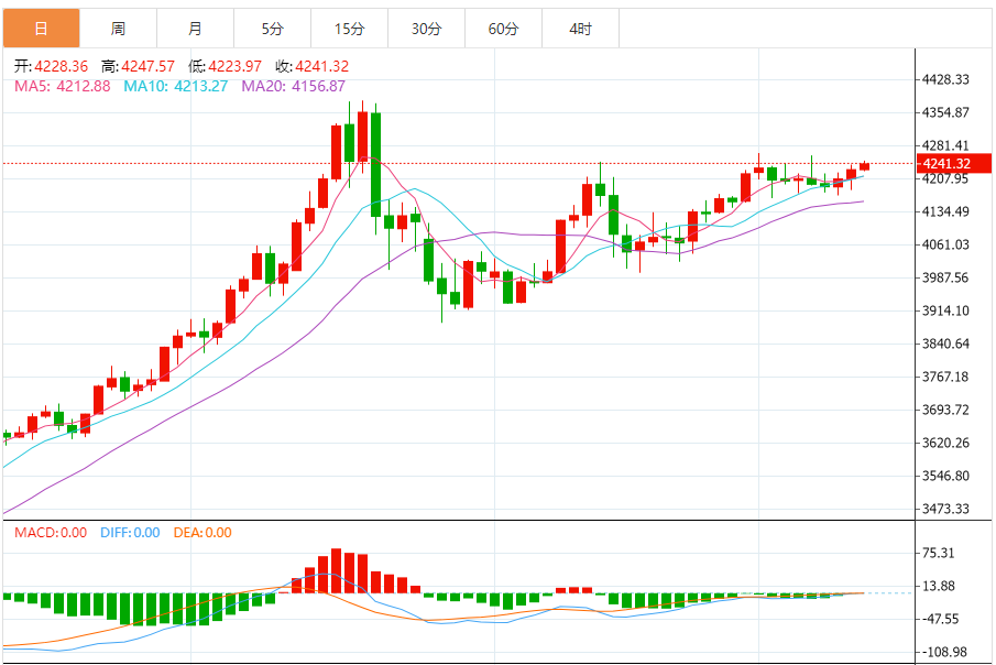 日线图显示,黄金昨日收出带上下影线的阳柱,收盘价站稳MA5与MA10均线粘合处(4220美元),形成有效支撑。当前5日、10日、20日均线呈多头排列,MACD指标在零轴上方运行,红柱虽略有缩短但未出现背离,表明上行趋势仍具韧性。强支撑位于抛物转向点与中轨共振区域4170-4152美元,此区间也是前期突破后的回踩确认位,具备较强防守力度。