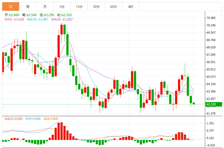 周三(10月1日),美原油价格交投于62.310美元/桶附近,跌幅为0.08%。