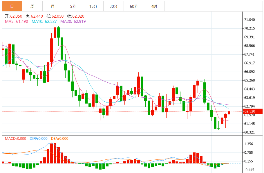 周三(10月8日),美原油价格交投于62.310美元/桶附近,涨幅为0.96%。