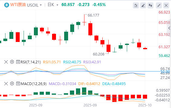 由于中东地缘政治紧张局势缓解,WTI 失去了吸引力。交易员将密切关注美国联邦政府关门将持续多久。截至目前,WTI原油报价60.85美元,Brent原油报价64.66美元。