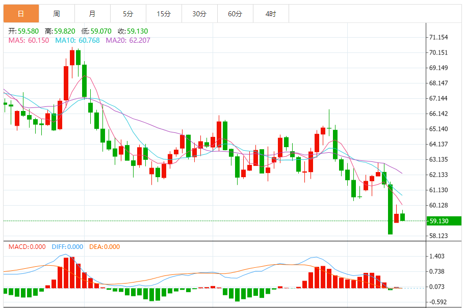 周二(10月14日),美原油价格交投于59.130美元/桶附近,跌幅为0.59%。