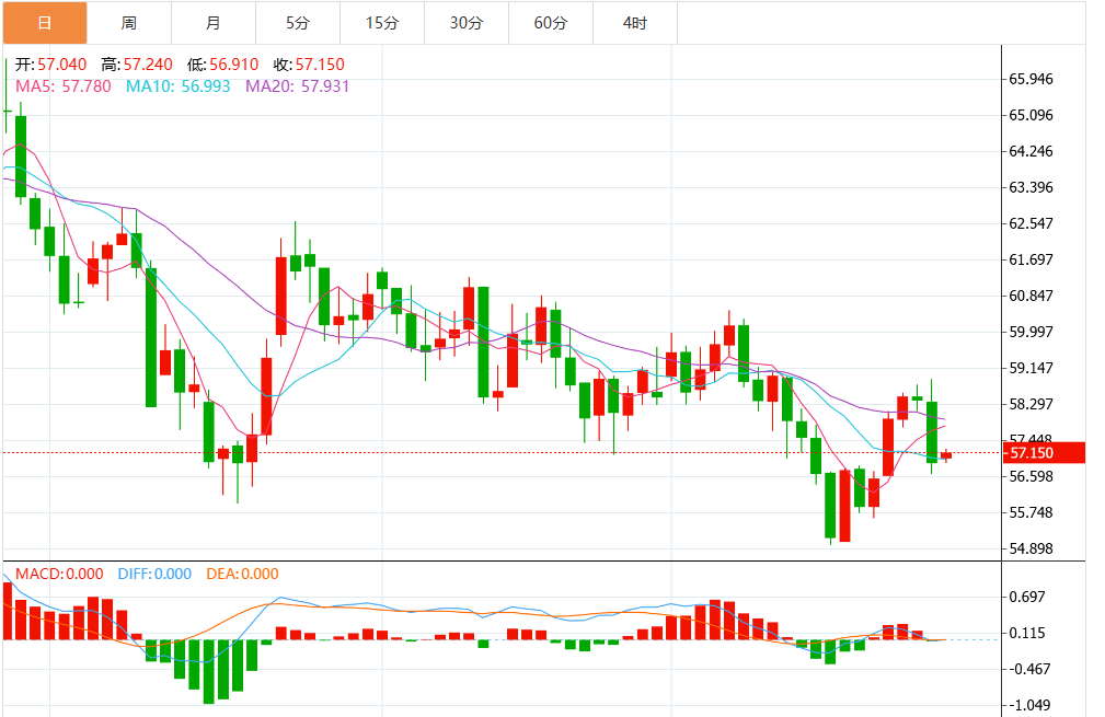 技术上,价格在前期快速下探后运行于低位震荡区间,目前仍受制于下行趋势压力。日线K线显示,WTI在56美元附近获得阶段性支撑,该位置接近前期低点区域,短线买盘开始介入,但反弹力度有限。