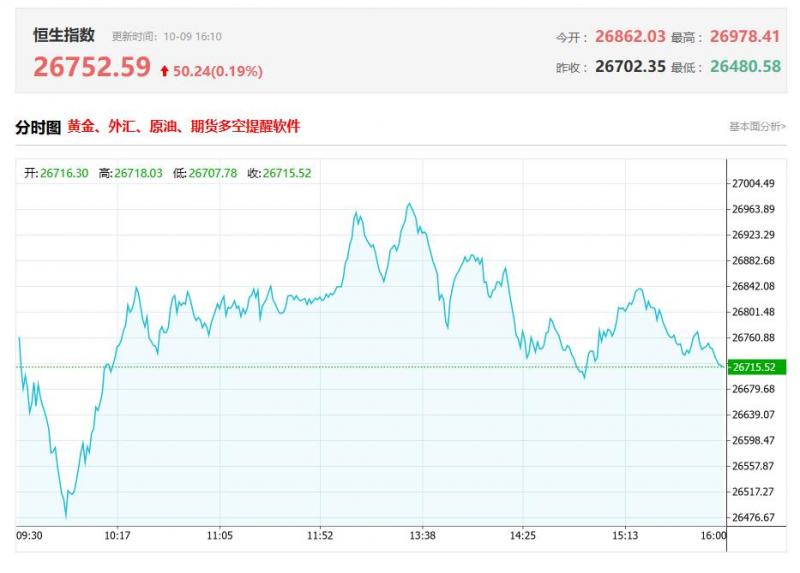 香港恒生指数10月9日(周四)收盘下跌76.87点,跌幅0.29%,报26752.59点;