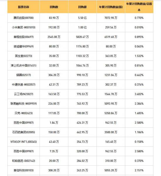 石四药集团(02005)、方正控股(00418)、摩比发展(00947)、天福(06868)、永安国际(00289)、万咖壹联(01762)、VITASOY INT'L(00345)、腾讯控股(00700)、固生堂(02273)、明源云(00909)、百宏实业(02299)、希玛眼科(03309)、归创通桥-B(02190)、力鸿检验(01586)、碧桂园服务(06098)、金涌投资(01328)、IGG(00799)、酷派集团(02369)、津上机床中国(01651)、天安卓健(00383)、联易融科技-W(09959)、旭日企业(00393)、首佳科技(00103)、歌礼制药-B(01672)、和铂医药-B(02142)、小米集团-W(01810)、美亨实业(01897)、绿城管理控股(09979)、首程控股(00697)、诺诚健华(09969)、九毛九(09922)、锅圈(02517)、永达汽车(03669)、心玮医疗-B(06609)、云工场(N23027)、中电光谷(00798)、百胜中国(09987)、贝壳-W(02423)、百胜中国(09987)、中通快递-W(02057)于2025年10月10日进行了回购。其中,回购金额最大的为腾讯控股(00700),回购数量83.90 万,回购金额5.50 亿元。